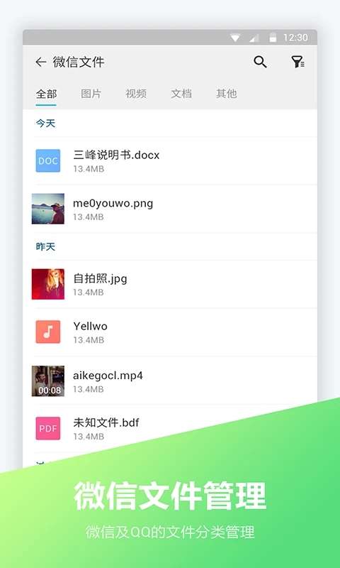 文件管理软件合集支持智能文件分类,管理图片、视频、音频、文档、安装包、压缩包、微信文件、qq文件等。搜索文件很简单,一键搜索就能找到想要的文件。手机存储空间的使用情况一目了然。快来下载使用吧非常不错哦