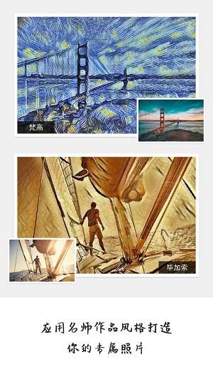 因为软件的发展现在的我们已经是见过了很多种形式的画作,油画水彩画国画等等都是被世人所熟知的派系,大画家是一个可以将照片变成上面的形式的滤镜,瞬间让自己的画作变身为杰出之作,让自己也体验一把变身为大画家的感觉。