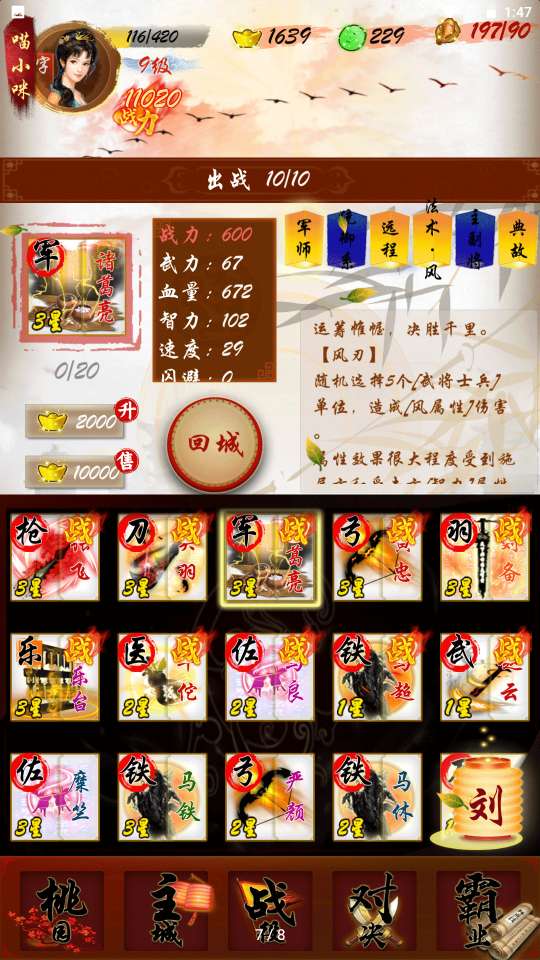 2、武将是可以养成升级的。但是需要碎片和元宝(送的元宝目测前期勉强够用,中期就会开始不行...)