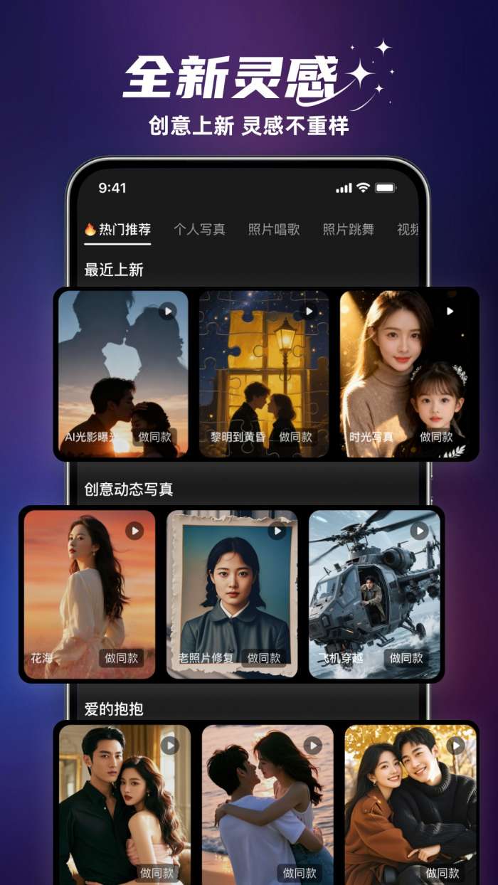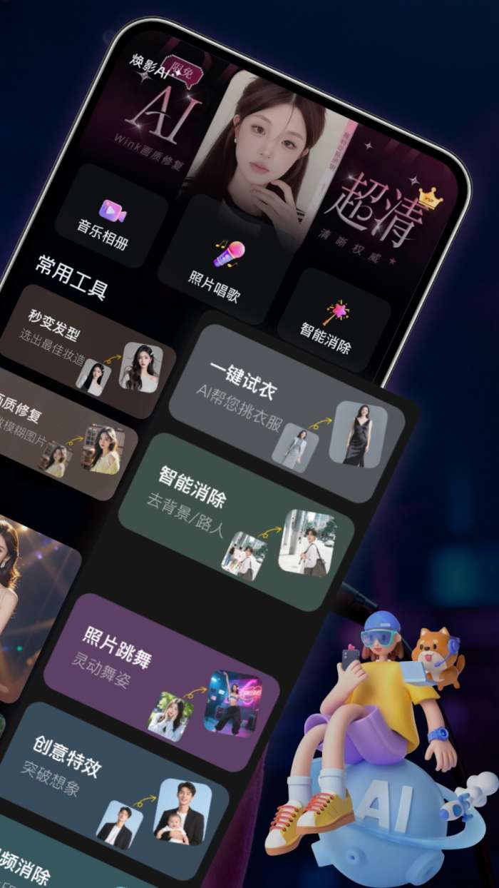 焕影AI是好玩又上头的AI创意神器!照片能动、视频能修、颜值能打,零基础也能玩出大神级效果,轻松拿捏朋友圈流量。拥有AI视频功能音乐相册一键出片,照片丢进去,大片自动生成,卡点配乐全搞定,懒人也能做出绝美纪念影集!照片唱歌,秒变歌王。一张照片直接开口唱歌,AI 神同步表情神态,不用露脸不用唱,轻松 C 位出道变歌王!照片跳舞,灵动舞姿。静态照片秒变跳舞达人,AI 一键安排魔性又丝滑的舞姿,怎么好玩怎么来!