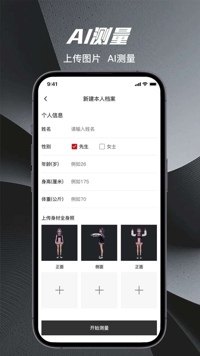 1、智能测量功能:支持单人或辅助模式测量,自动识别肩宽、胸围等23个关键尺寸,并提供动态测量指导提示。