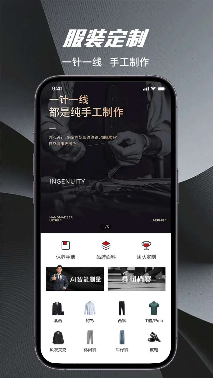 2、在主页上,您可以查看“团队定制”、“品牌面料”、“维护手册”、“身体轮廓”、“AI智能测量”等功能,并浏览各种服装类别(如商务通勤、女式小香型上衣等)。