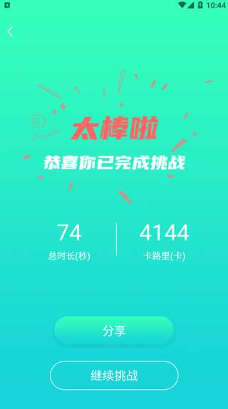 5、完成挑战后查看能量消耗,并可进行打卡分享。