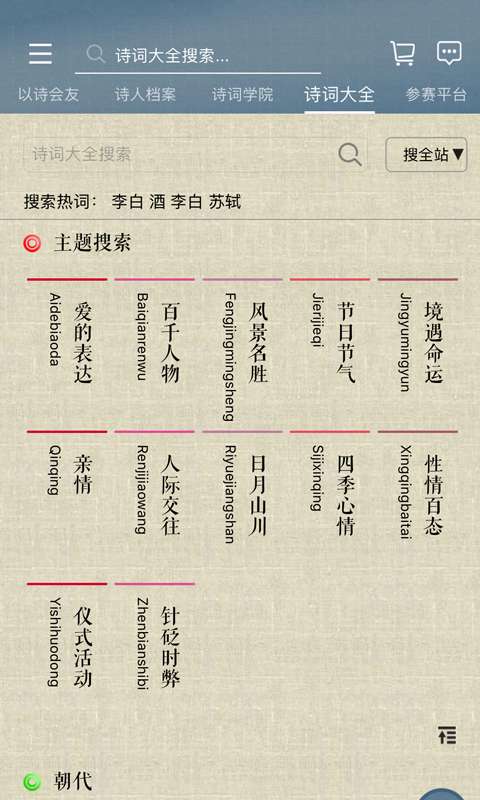 3、收录陶渊明、李白、杜甫、白居易、苏轼李清照等诗词作品近两千首,并正在陆续收录中华书局版《全唐诗》《全宋词》。支持按主题、朝代细致检索。