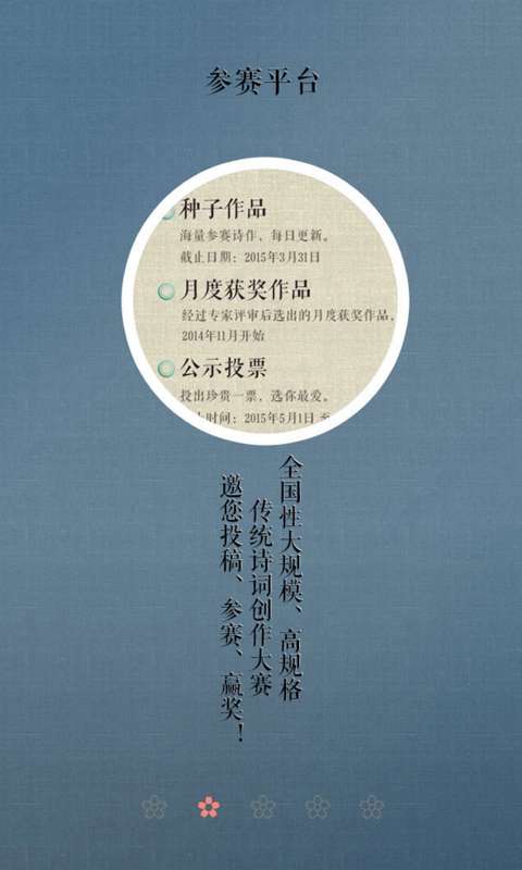2、注册可参加“诗词中国”传统诗词创作大赛。全国性大规模、高规格传统诗词创作大赛邀您投稿、参赛、赢奖。