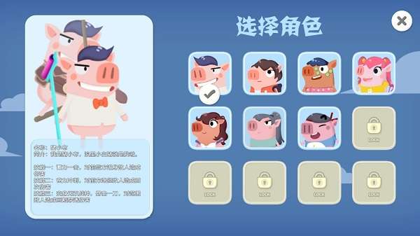 游戏里可供玩家挑选的角色总共有八位,他们分别是猪貂蝉、猪小布、猪小贤、猪一菲、猪益达、猪大力、猪咖喱和猪关谷。而关于这些角色的激活途径,估计会采用游戏币兑换和充值氪金相结合的双重模式。