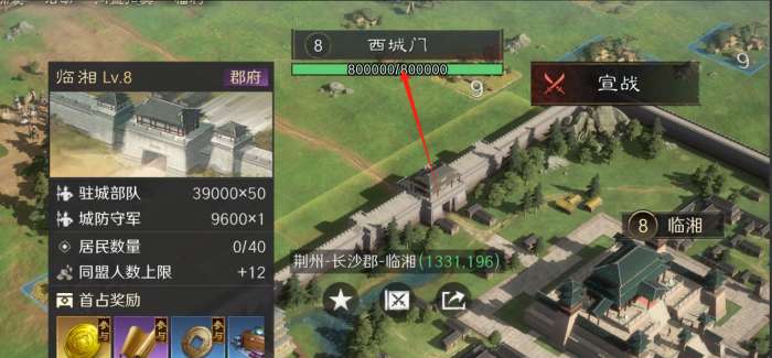 以下图城池为例,红色箭头所指的是城池精英守军,进攻方需要与其发生战斗,将40队27000兵力的精英守军处理完成后,每次进攻城池均会遇到7200兵力的城防守军。