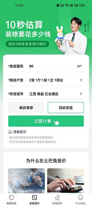 2、点击免费报价,在软件中填写房屋的面积和布局,计算房屋装修成本。
