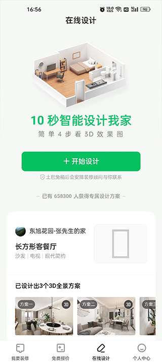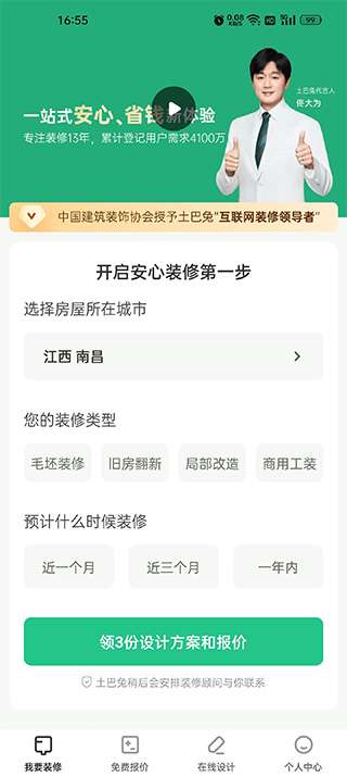 1、在本网站上下载并安装软件,注册并登录软件主页。在主页上填写您的房屋类型,即可收到三份设计方案和一份房屋装修报价。