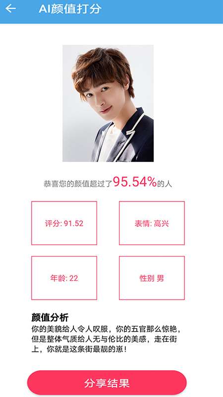 AI颜值检测评分是一款多方位的人脸检测工具,通过人脸识别技术,识别出人脸100多个特征点,进行大数据分析,根据你的脸型五官长相进行AI人工智能评分。各检测流程简单,用户只需要拍摄或上传本地照片,等待几秒钟后,就可以查看实时的检测结果,便捷的了解各种评分数据和类似信息。提供了分享功能,可以分享检测结果,一键转发到微信或QQ进行分享。