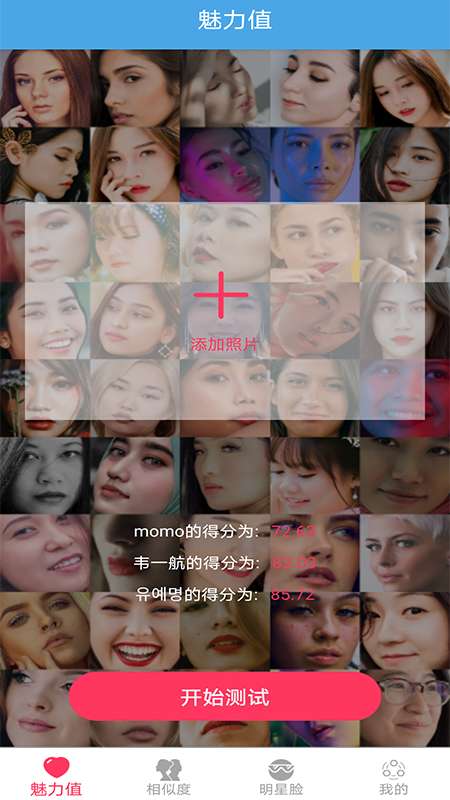 2、进入魅力值页面,就可以点击加号添加照片,上传本地照片完成测试。