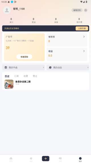 4、进入个人中心,用户可以查看到历史的观看信息及最新的动态。