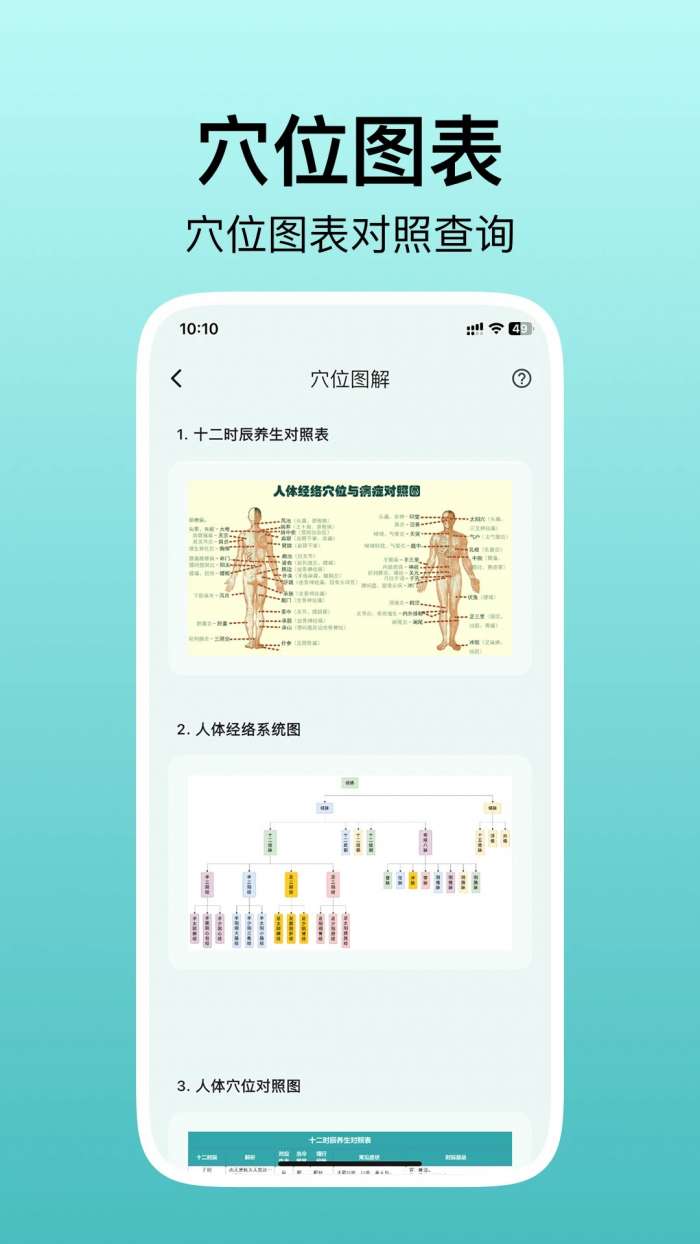 1、详细的穴位图:提供人体穴位的高清图,清晰标注每个穴位的位置,帮助用户快速识别。
