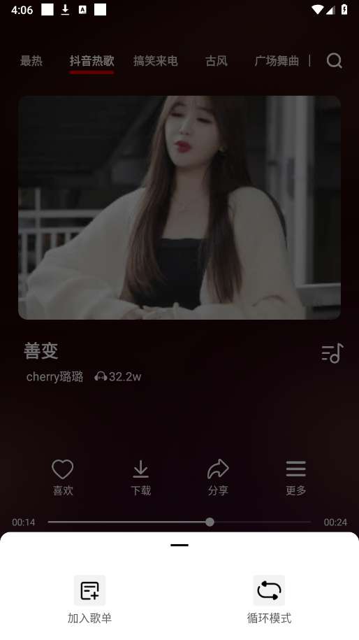 4、选择喜欢的音乐之后,可以将音乐进行收藏、加入歌单以及选择不同的模式。