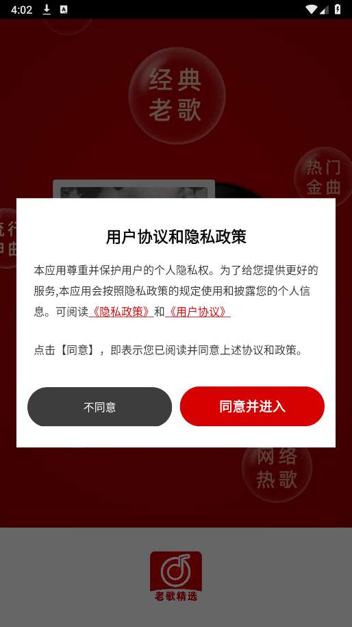 1、打开在本站下载安装的老歌精选app,同意相关的政策与协议。