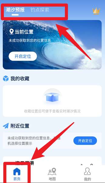 1、打开首页可查看“潮汐预报”与“钓点探索”,支持切换查看不同功能的潮汐信息。