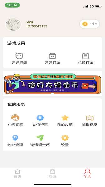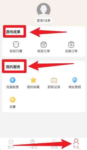5、在“我的”页面可查看娃娃行囊、娃娃订单、兑换订单等游戏成果,并管理充值优惠、收藏、抓取记录和地址信息。
