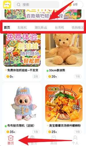 2、在首页顶部可切换到抓板机、潮玩新品、台湾机、低挡板区等分类,浏览并参与不同主题的抓娃娃活动。