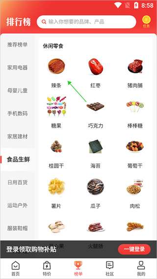 1、下载软件后直接安装打开,进入榜单页面,按产品类别查询,例如查询辣条排名可点击【食品生鲜】分类。