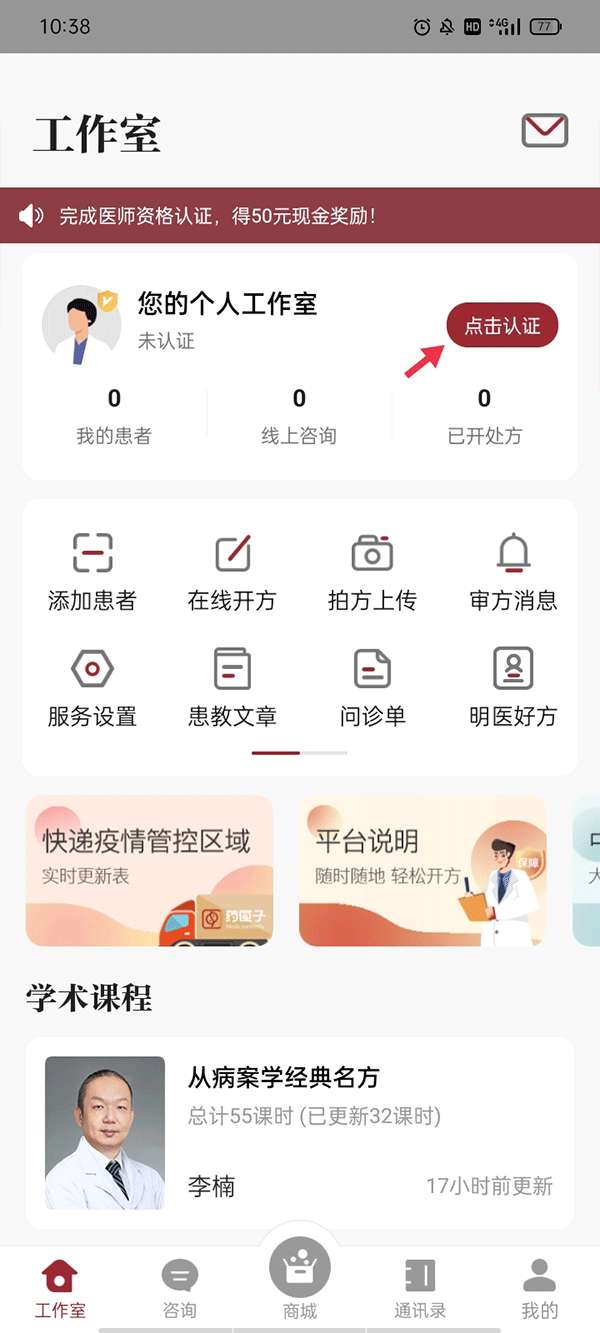 3、进入之后会看到自己的工作室,点击认证。