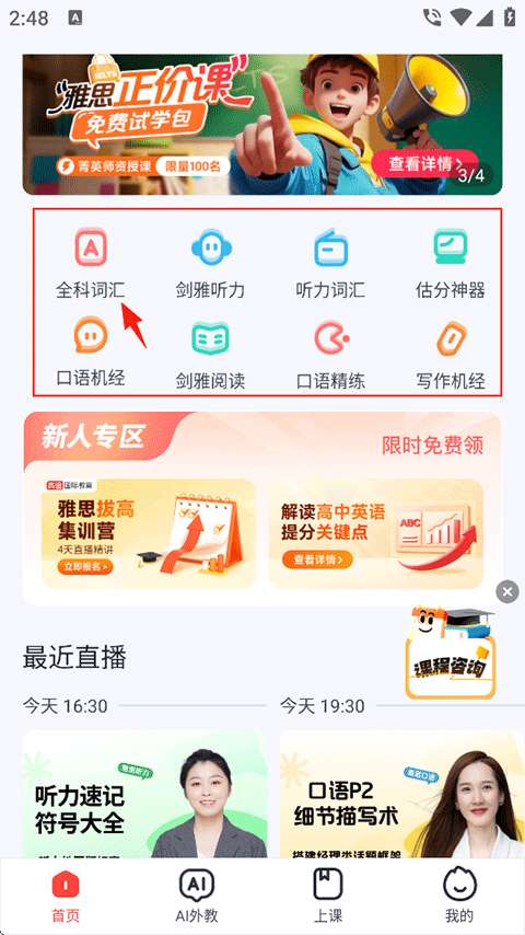 1、打开高途雅思官方版软件,点击首页-通用词汇。