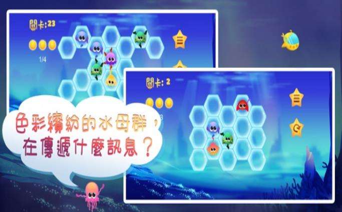 不思议连结在这款游戏中,大家可以看到摄影嗯,多边形方块组件的操作板面里面每一个空位钟都有不同颜色的水母在里面。颜色还是特别的鲜艳,蓝色,紫色,绿色,黄色,红色都有。一开始不会玩,可以看游戏的,说明他会告诉你,通过移动的方式,让水母的触手连接在一起,形成一个图案,或者是简单的手牵手。一开始关卡十分的简单,随便一动两下就通关了。