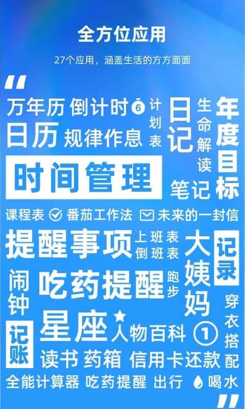 时间管理软件大全时间管理app顾名思义就是帮忙管理时间的应用软件,人们如果没有一个合理的时间规划,工作和学习都没有很高的效率,生活也会因此变得混乱不堪,只有良好的时间规划才能让你的生活变得更加的阳光有序,一起来规划好自己宝贵的时光吧,那么时间管理的软件又有哪些呢?小编为你带来以下时间管理的软件。