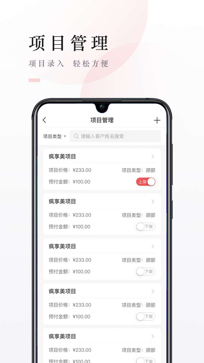 疯享美商家版是一款以打造特色信息管理,对于中小微企业以及美容业可以运用系统,进行项目管理以及账目管理等,非常便捷的管理软件。软件拥有先进技术,画面设计更加酷炫,界面设计更加唯美,让您体验更加功能齐全的的管理软件。软件采用最新技术,对用户进行严格把关,更好的运营,让您管理企业更加轻松。您可以在线进行信息管理,将项目以及订单还有账目管理的更加条理分明。软件采用更加唯美的画面设计,更加新颖的功能设计,让您感受更加快捷高效的管理应用。软件可以有效的管理订单,让您所有订单一目了然,管理起来更加便捷高效。