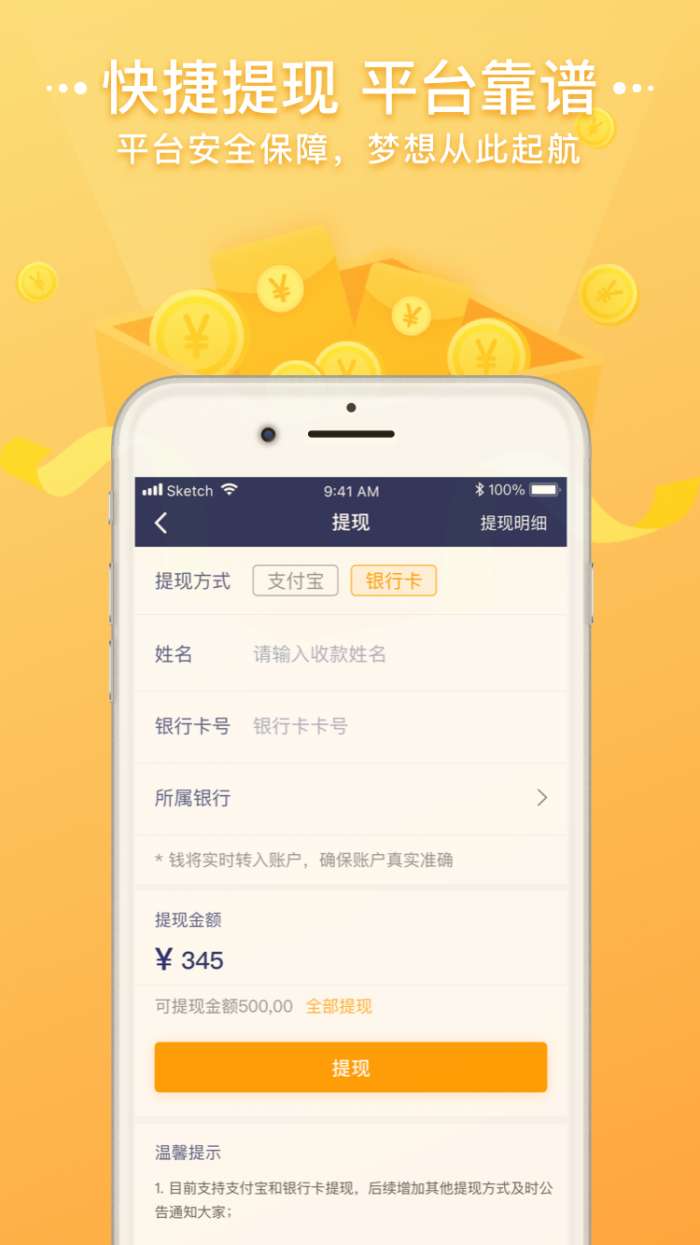 1、在线提现,可以在线的通过平台完成任务后进行现金,提前帮助您快速的进行到账,并且能够享受提现的1元服务