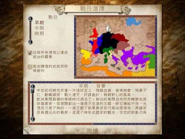 作为欧洲历史上最为腥风血雨的时代,中世纪的背景设定让玩家有机会率领军队横跨欧陆战场和圣地。本作的大战役覆盖的时间段有4个半世纪,从1080年一直到1530年。它从骑士和十字军的黄金时 代开始,横跨蒙古入侵时期以及火药的发明,最后到用枪的专业军队的出现以及美洲大陆的发现为止。