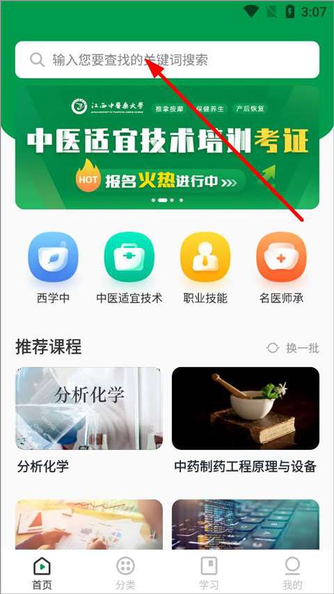 1、打开中医药在线app,注册登录。在主页上,你可以看到“西学中医”、“中医之道”、“职业技能”、“师徒传承”等栏目。也有推荐的学习课程。点击搜索框,输入关键词搜索课程。