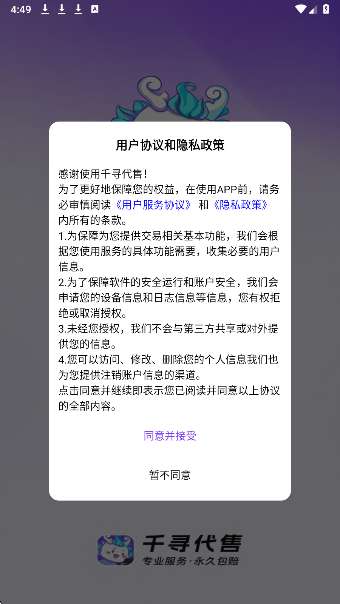 1、同意用户协议,进入千寻代售app。