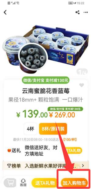 3、在商品页点击加入购物车,即可将心仪水果添加至购物车结算。