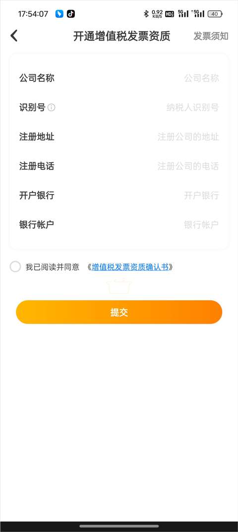 4、按提示填写相关开票资料,确认无误后提交即可完成开通。