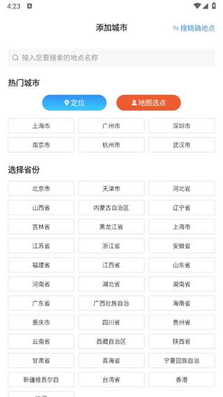 1、打开软件之后我们需要添加城市,可以进行定位,也可以在地图选点;