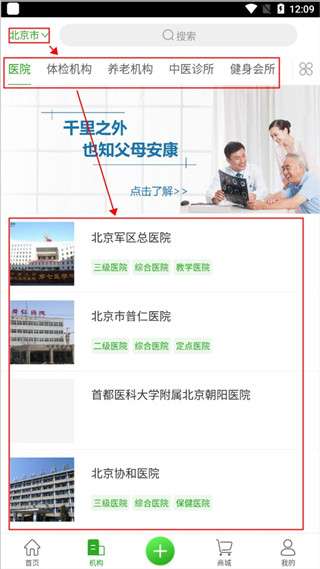 3、在该页面可以选择-地点-然后再选择:医院、体检机构、养老机构等进行查看。