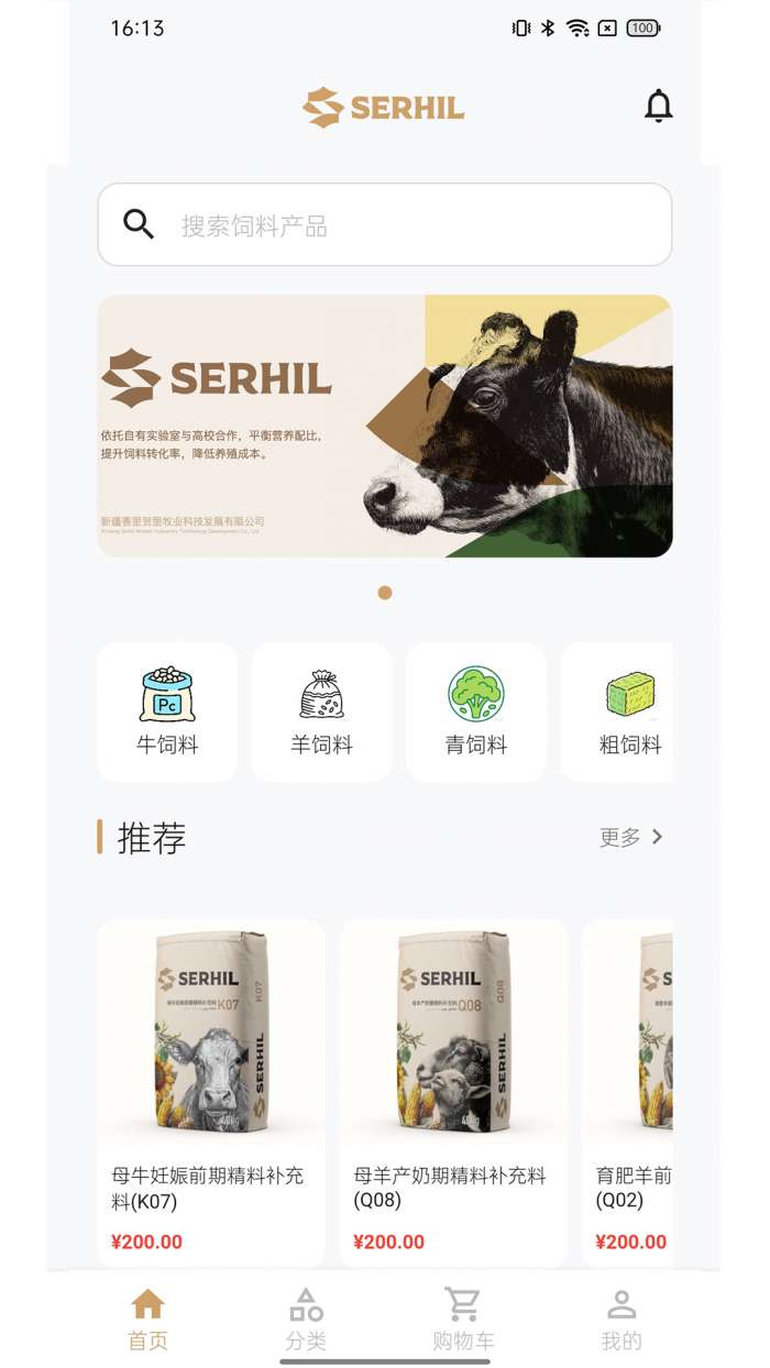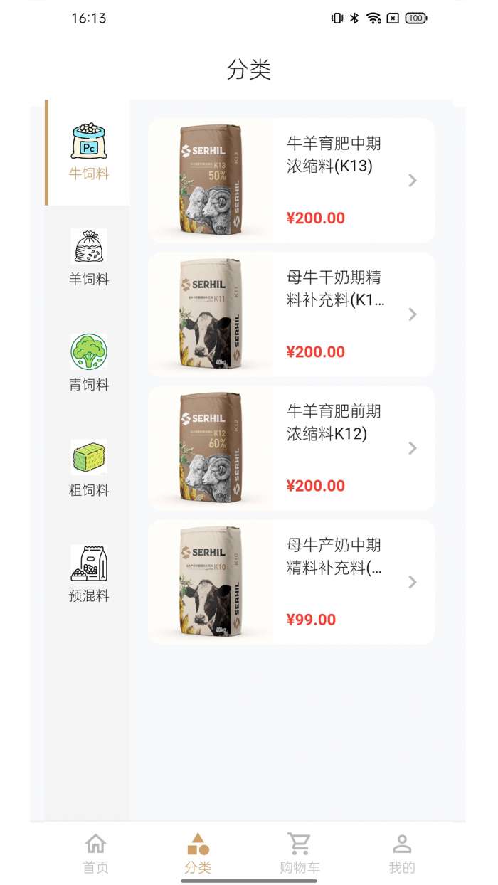 分类页能快速切换不同品类的饲料,牛饲料、羊饲料、青饲料、精饲料一目了然,点击进入就能查看对应品类的全部产品。