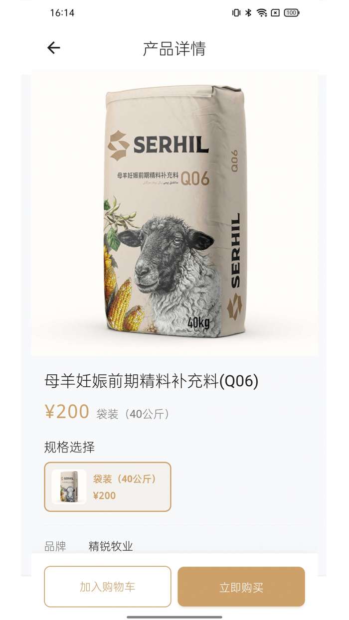 产品详情页可以查看饲料的详细规格、价格、适用场景和品牌信息,还能直接选择规格加入购物车,一键下单。