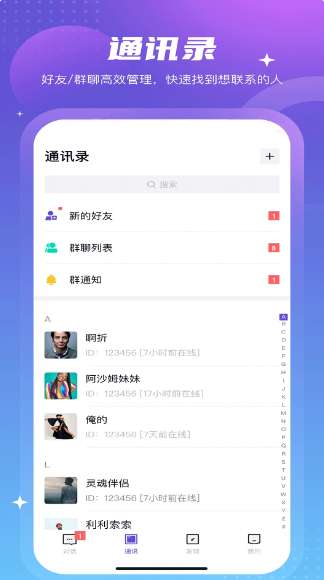 2、通讯录 你可以在通讯录中查看自己的朋友列表,找到朋友的联系方式。