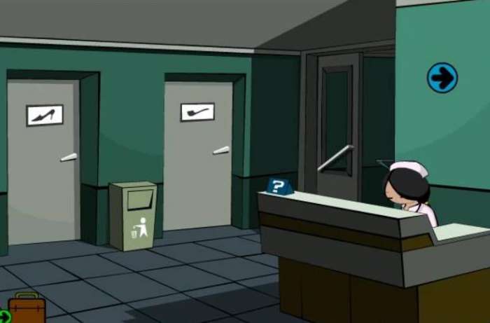 2.看到厕所.服务台和另一个门,玩家随意任选门或者男厕进入再返回,会出现剧情CG,护士小姐会到服务台,此时点击护士小姐,她会认为主角是电气修理工,然后给主角一把钥匙。