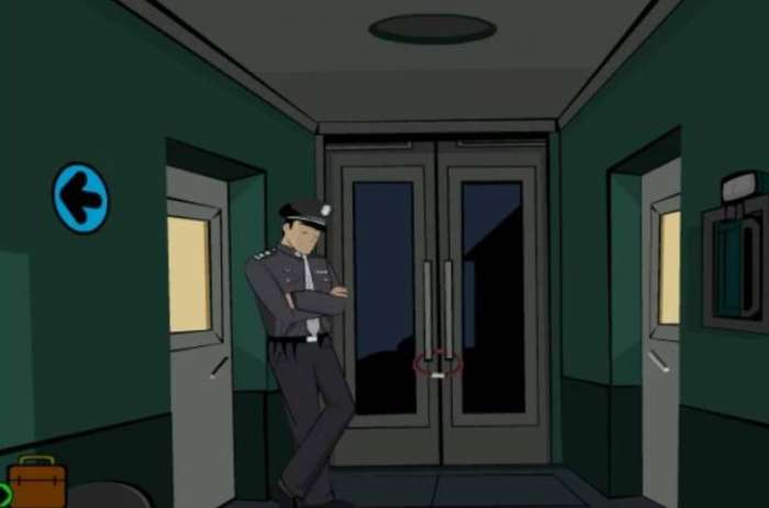3.进入另一个大门,直走,看到警察叔叔,此时在屏幕右边墙上有一把手电,点击后获得手电。