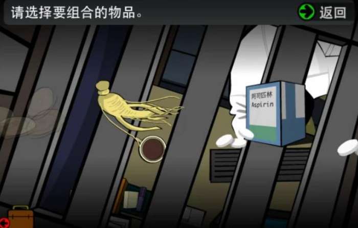7.点下面的箭头,点右边桌子上的书,拿到中西药手册,点手册,点阅读,看到上面写着:甘草与阿司匹林合用会导致胃肠不良反应,点左下角工具箱,收回道具。点左侧西药柜,点药柜下层左侧的药盒,拿到阿司匹林,后退;点右侧中药柜,在随机的抽屉里拿甘草,继续找人参.灵芝。