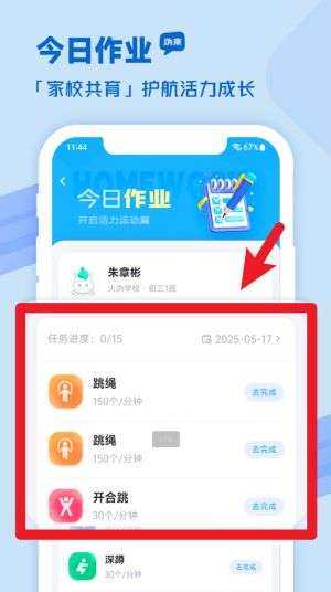 3、“今日作业”功能将跳绳、开合跳等任务进度清晰展示,便于用户每日打卡与家校协同完成训练目标。