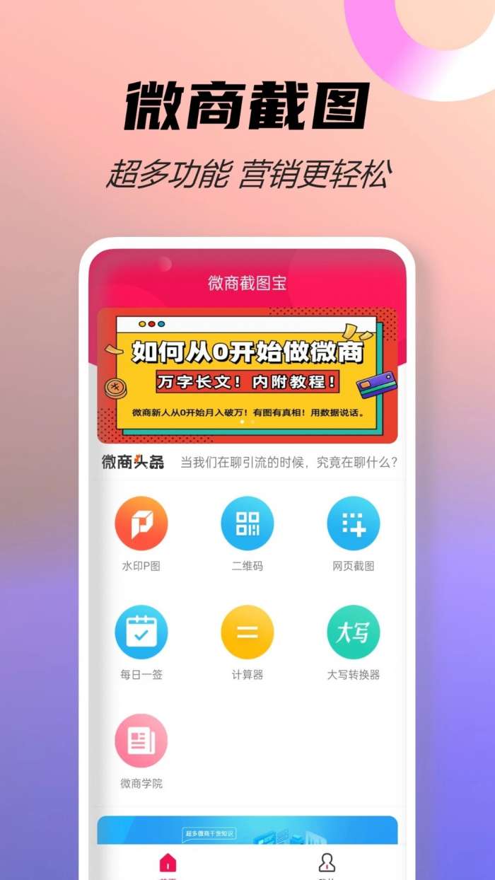 微商截图宝是一款非常实用的手机截图软件,为用户提供丰富的截图功能,包括网页截图,随机截图等,允许用户自由选择使用,轻松体验便携的截图操作,还具有全新的截图编辑模式,可以自由编辑保存截图图片,自由享受优质的服务和体验,还提供全新的界面设计,无需任何经验即可上手使用,可以轻松掌握各种截图技巧和方式,还拥有强大的拼图功能,随时随地让用户轻松拼图,有需求的用户欢迎来本站下载体验吧。