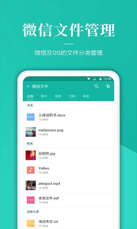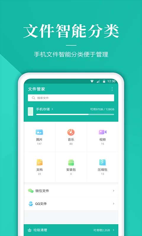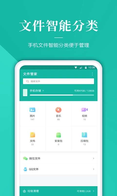 文件管理软件合集支持智能文件分类,管理图片、视频、音频、文档、安装包、压缩包、微信文件、qq文件等。搜索文件很简单,一键搜索就能找到想要的文件。手机存储空间的使用情况一目了然。快来下载使用吧非常不错哦