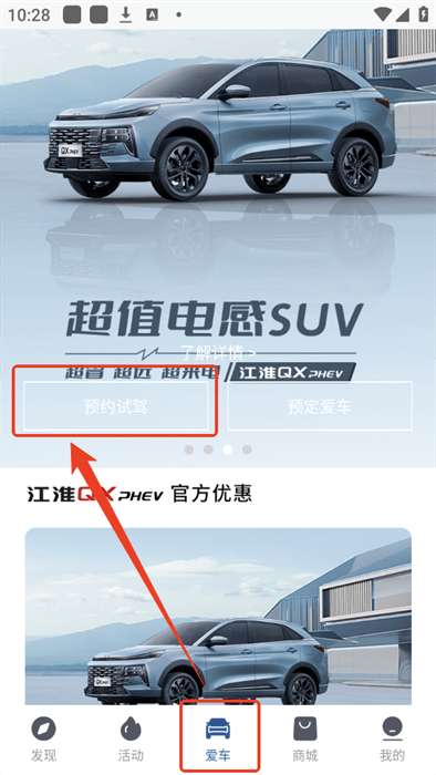 1、进入【爱车】专区,点击上方的“预约试驾”。
