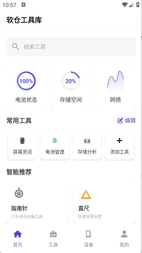 软仓工具库App,一款实用又免费的手机工具箱。它聚合了设备工具、测量工具、计算工具、生活工具等多种工具,各类工具应有尽有,分类细致,查找方便。而且,所有工具统统免费使用,一站式满足大家生活、工作等各方面需求。有需要的朋友,欢迎前来使用。