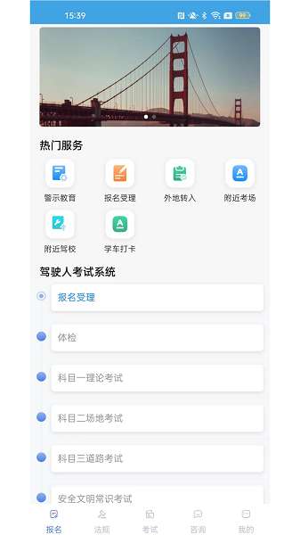 2、一站式服务:整合驾校报名、体检预约、考试缴费、进度查询等全流程线上办理。