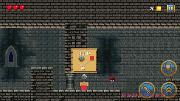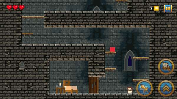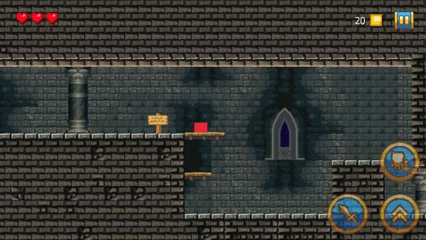 起初,你仅是一个红色方块,当遇到物品或触发对话时,点击小剑;若需要进行跳跃操作,就点击向上的箭头。