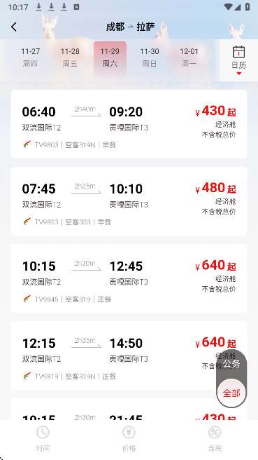 3、点击【立刻查询】即可看到更多票务价格以及航班时间讯息。